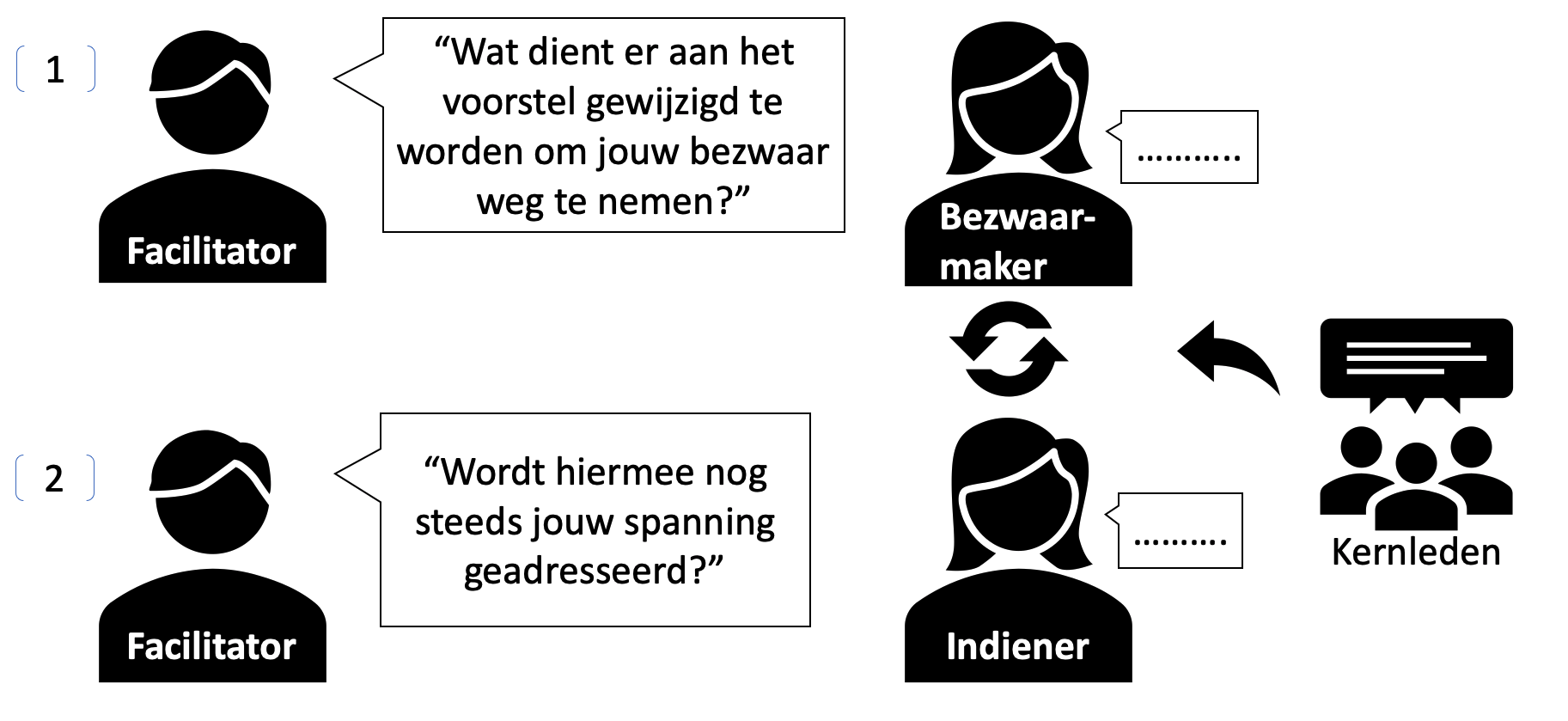 Als facilitator wil je alleen een antwoord horen (bezwaar of geen bezwaar) en geen andere antwoorden of allerlei inleidende en afleidende bespiegelingen. Herhaal de laatste vraag zo vaak als nodig.